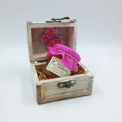 Cassetta in legno, decorata e resa golosa da 2 vasetti da 45g e 1 vasetto da 120g* di Delizia alla Frutta assortiti. Incluso un prendimiele in legno.
