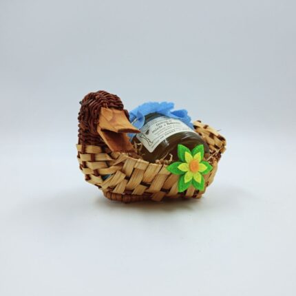 Cestino in vimini lavorato a forma di paperella, decorato e reso goloso da 1 vasetto da 45g di Delizia alla Frutta assortito.